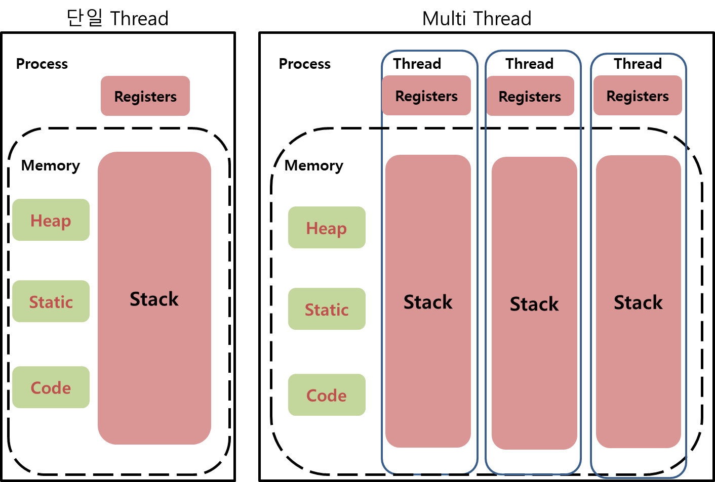 그리고, 각각의 Thread 마다 registers와 stack을 소유하고 있다.