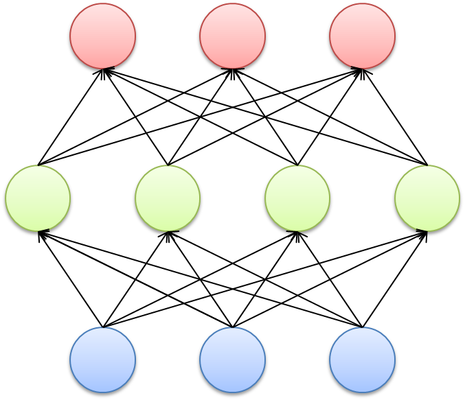 - 아래 그림과 같이 입력계층과 출력계층 사이에 은닉층(Hidden-Layer)가 있는 구조를 가진다.