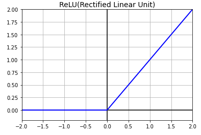 def relu(a): return np.maximum(0, a) a = np.linspace(-2, 2, 200) plt.plot([-2, 2], [0, 0], 'k-') plt.plot([0, 0], [-0.2, 2.0], 'k-') plt.plot(a, relu(a), "b-", linewidth=2) plt.grid(True) plt.title("ReLU [Rectified Linear Unit]", fontsize=15) plt.axis([-2, 2, -0.2, 2]) plt.show()