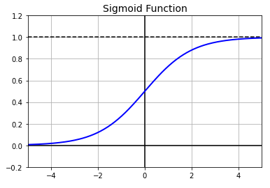 def logit(a): return 1 / ( 1 + np.exp(-a)) a = np.linspace(-5, 5, 200) plt.plot([-5, 5], [0, 0], 'k--') # x축 plt.plot([-5, 5], [1, 1], 'k-') # (0.1)축 plt.plot([0, 0], [-0.2, 1.2, 'k-') # y축 plt.plot(a, logit(a), "b-", linewidth=2) # Sigmoid plt.grid(True) plt.title("시그모이드 함수 [Sigmoid Function]", fontsize=15) plt.axis([-5, 5, -0.2, 1.2]) plt.show()