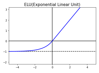 def elu(a, alpha=1): return np.where(a < 0, alpha * (np.exp(a) - 1), a) plt.plot([-5, 5], [0, 0], 'k-') plt.plot([0, 0], [-2.2, 3.2], 'k-') plt.plot([-5, 5], [-1, -1], 'k--') plt.plot(a, elu(a), "b-", linewidth=2) plt.title("ELU(Exponential Linear Unit)", fontsize=15) plt.axis([-5, 5, -2.2, 3.2]) plt.show()