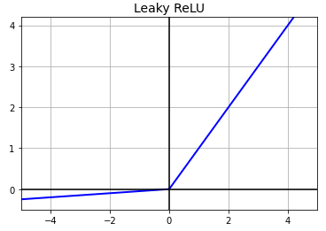 def leaky_relu(a, alpha=0.01): return np.maximum(alpha*a, a) plt.plot([-5, 5], [0, 0], 'k-') plt.plot([0, 0], [-0.5, 4.2], 'k-') plt.plot(z, leaky_relu(a, 0.05), "b-", linewidth=2) plt.grid(True) plt.title("Leaky ReLU", fontsize=15) plt.axis([-5, 5, -0.5, 4.2]) plt.show()