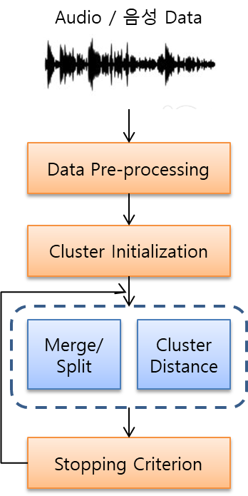 - Top-Down Approach : 단일 화자 모델로 전체 음성 샘플을 모델링 한 후 전체 화자 수가 계산될 때까지 새로운 모델을 연속적으로 추가하는 방식. Bottom-Up 방식에 비하여 성능은 떨어지지만, 계싼 효율이 좋고 클러스터 정제를 통해 성능 향상이 가능