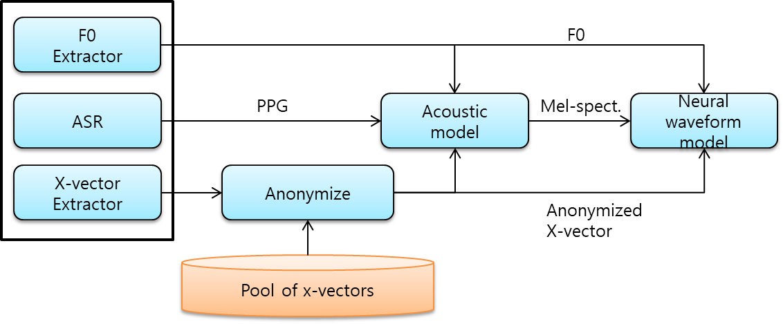 x-vector를 이용한 화자 익명화 방법 음성 데이터에서 개인의 데이터를 공유하는 것은 보안 및 개인정보 보호문제에 있어서 많은 문제점이 있다. 뿐만 아니라 사용자의 음성 데이터를 획득하여 음성 합성 시스템(TTS)을 적용하여 화자의 음성 발언을 생성할 수 있고 범죄에 이용될 수도 있다. 그래서 음성 데이터를 공유하기 전에 화자의 신원을 숨기는 기술이 개발되었고, 이 기술이 바로 화자 익명화 기술이다. 1. 화자 익명화 시스템 구조 입력 음성에 대하여 음성 인식 (ASR, Automatic Speech Recognition)을 진행하고, 기본 주파수(F0, Fundamental Frequency)와 x-vector에 대한 특징을 추출하는 과정을 먼저 진행한다. 그런다음 DNN 기반의 ASR 시스템을 사..