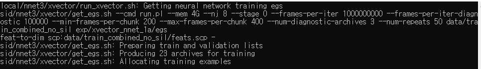 allocate_egs.py 무한루프 현상 KALDI Recipe 중 voxceleb 을 진행하다가 stage 6 ~ 8 x-vector training 부분에서 무한루프 에러가 발생했다. 이 화면에서 몇시간이 지나고도 멈춰있다면 아래 방식으로 해결이 가능하다. sid/nnet3/xvector/allocate_egs.py 에서 일부 코드 수정 ... (생략) line 178 def get_random_utt(spkr, spk2utt): this_utts = spk2utt[spkr] this_num_utts = len(this_utts) i = random.randint(0, this_num_utts-1) utt = this_utts[i] return utt ...(생략) line 255 for n in ..